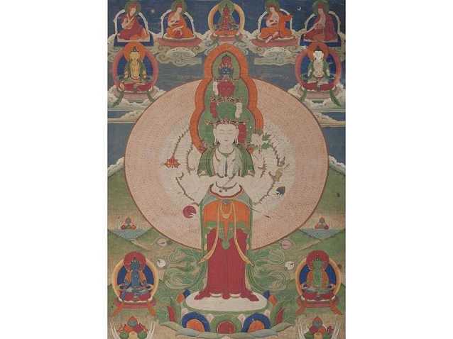 阿弥陀佛忽然显现在观音的面前,对观音说道:佛子!不必徒自吃苦,众生绝难一时全都救毕,但你既已立下宏愿,现在给你十一个头,你可以随机随时化身,永久广度众生。"以神通力把裂为千片之身变化成为具足千手千眼的化身,碎为十片的头化为十面有的面露微笑,有的现忿目相的面容,在十面的顶上再化出一面阿弥陀佛之面容作为引导加持的表义,这就是观世音大士以十一面千手千眼之相救度众生的缘起由来了。